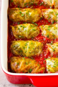 This stuffed cabbage rolls recipe is cabbage leaves filled with beef and rice, coated in a homemade tomato sauce and baked to perfection. A comfort food classic that’s hearty, delicious and simple to make.